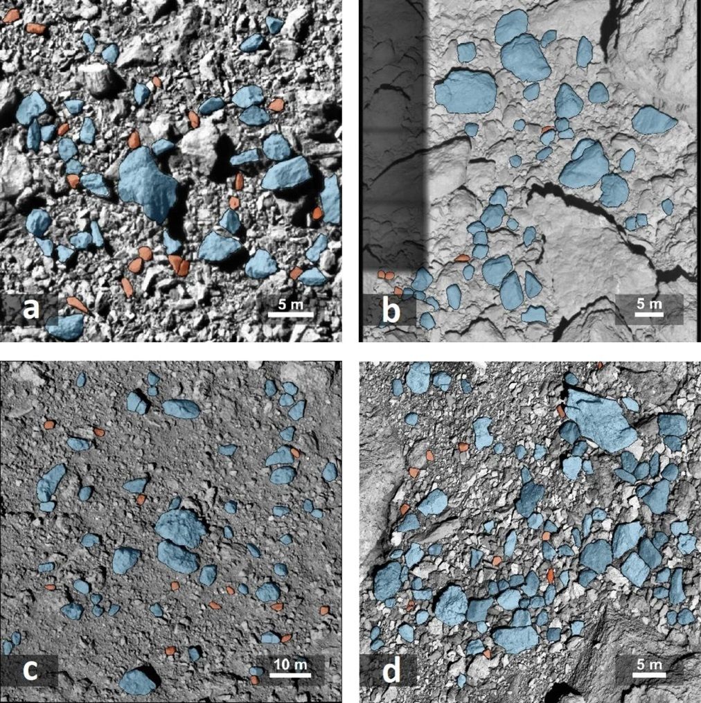 Examples of one of the High-resolution images for each asteroid surfaces studied. The images contrast have been enhanced with a CLAHE filtering for visualisation purposes only. (a) Dimorphos of the binary system Didymos taken by DRACO30, (b) Asteroid Itokawa taken by AMICA27, (c) Asteroid Ryugu taken by ONC-T56, (d) Asteroid Bennu taken by OCAMS29. (Credit: A. Duchene and C. Robin (ISAE-SUPAERO)