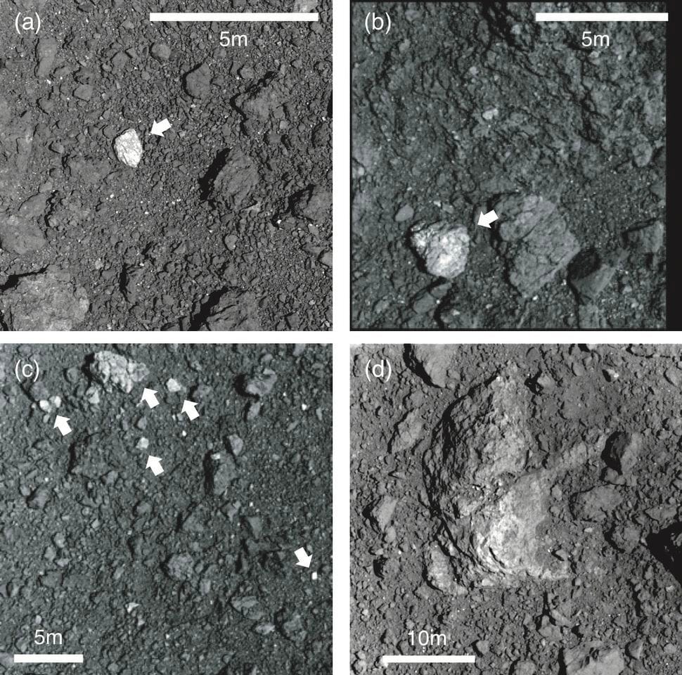 Images captured by Japan's Hayabusa2 spacecraft show bright S-type rocks that contrast sharply with the darker material composing most of asteroid Ryugu. (Credit: 2020 Tatsumi et al.)