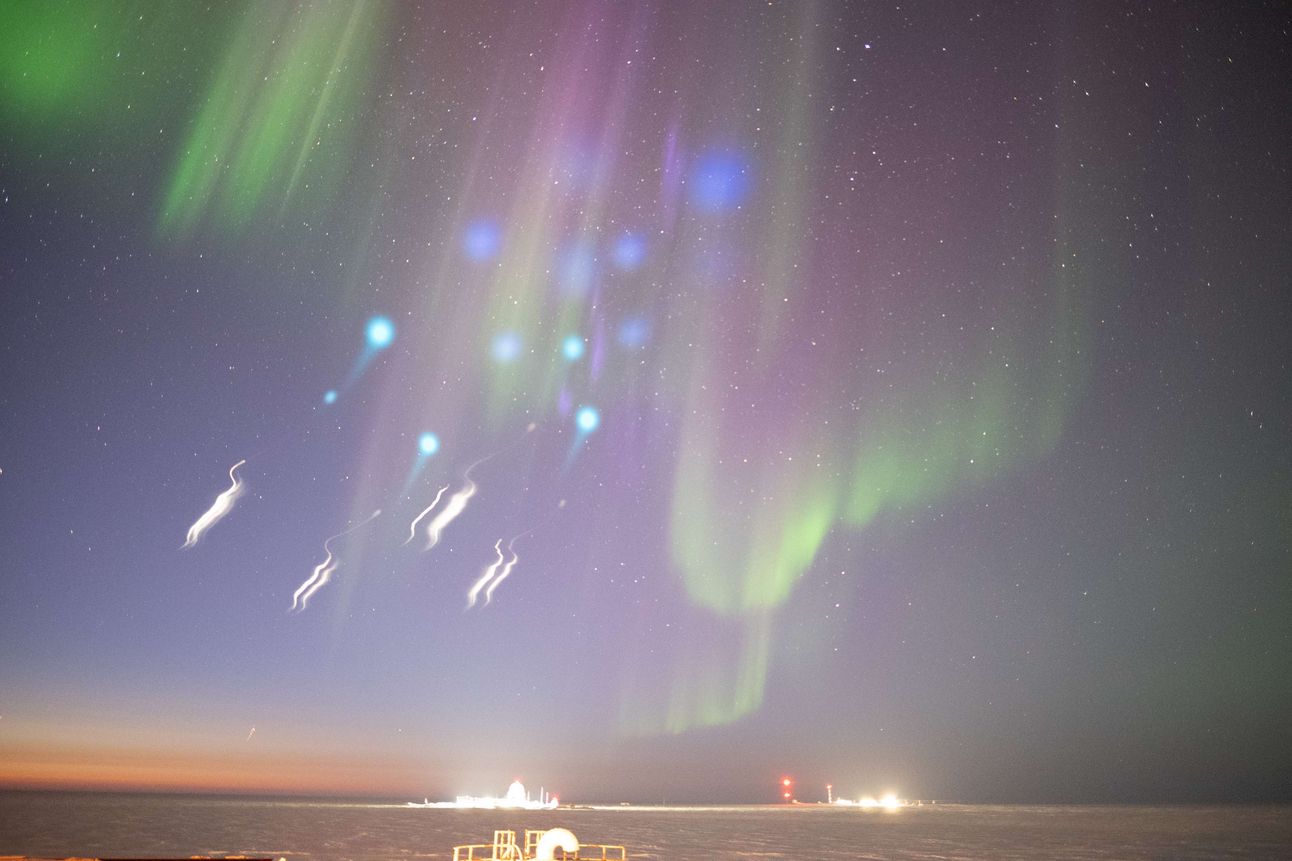 Vapor tracers light up the atmosphere over the Arctic Ocean as seen from Utqiagvik, Alaska, early on March 25, 2025. (Credit: AWESOME mission)