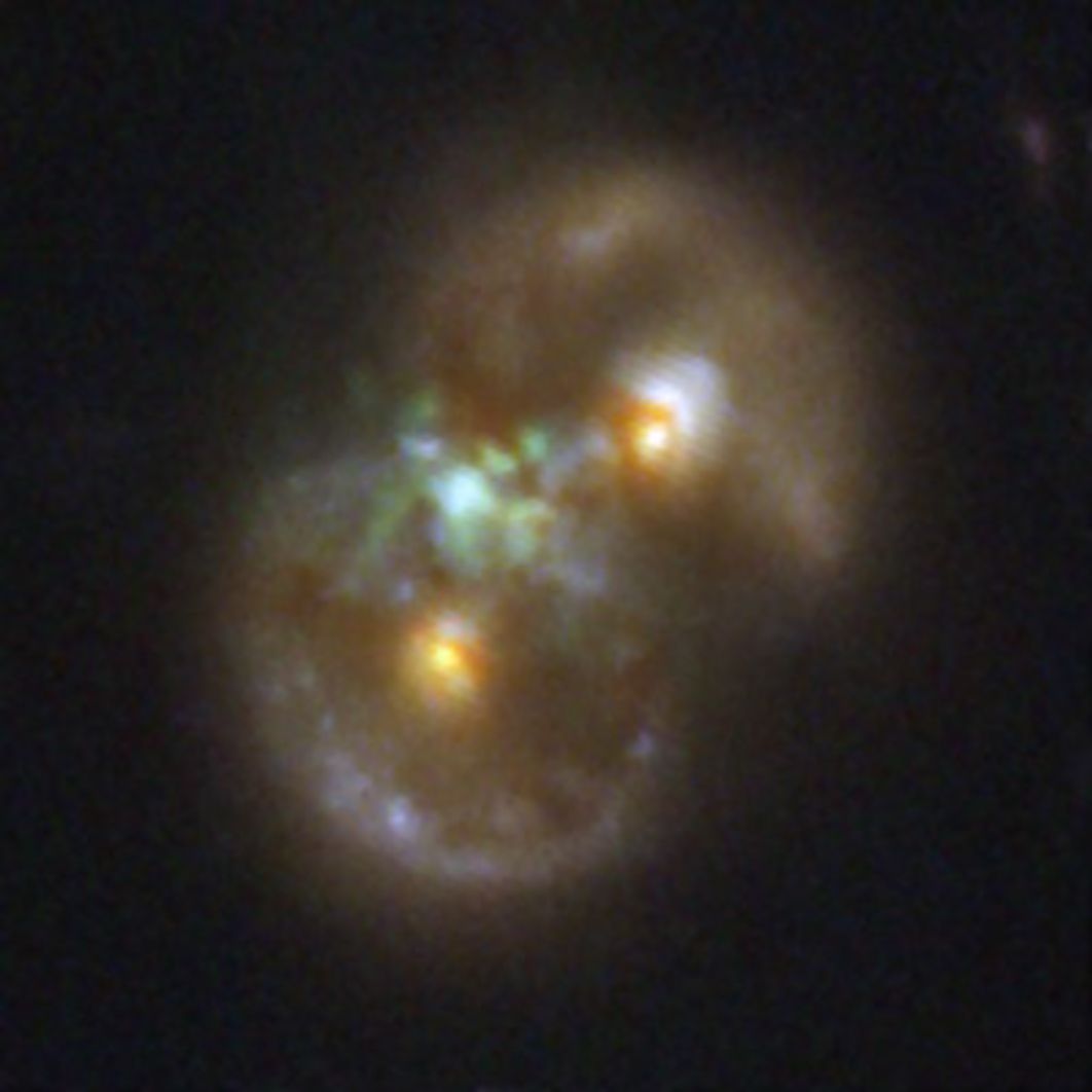 This NIRCam image from NASA’s James Webb Space Telescope shows the Infinity Galaxy—a merger of two spiral galaxies—featuring dual stellar rings and yellow-colored galactic nuclei. Ionized hydrogen appears in green between the galaxies, where astronomers have identified a million-solar-mass black hole possibly formed through direct collapse. The image maps near-infrared light with blue (0.9 microns), green (1.15–1.5 microns), and red (2.0 microns) filters. (Credit: P. van Dokkum (Yale University) / NASA / ESA / CSA / STScI)