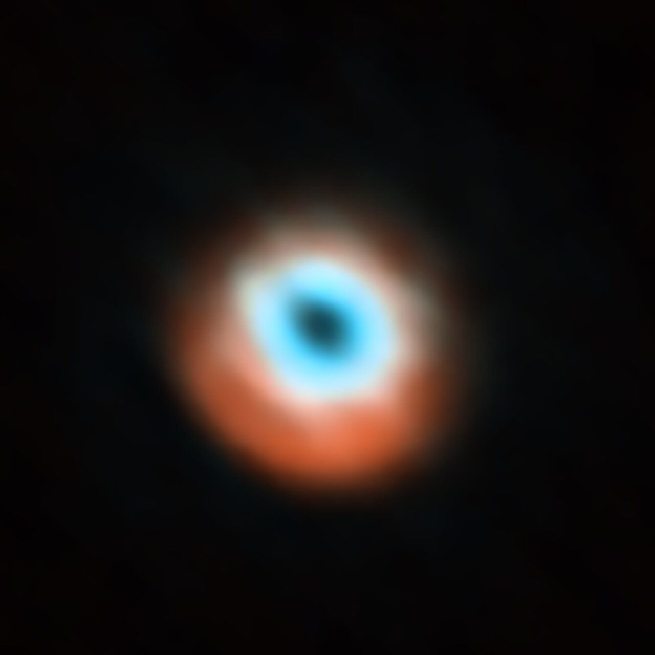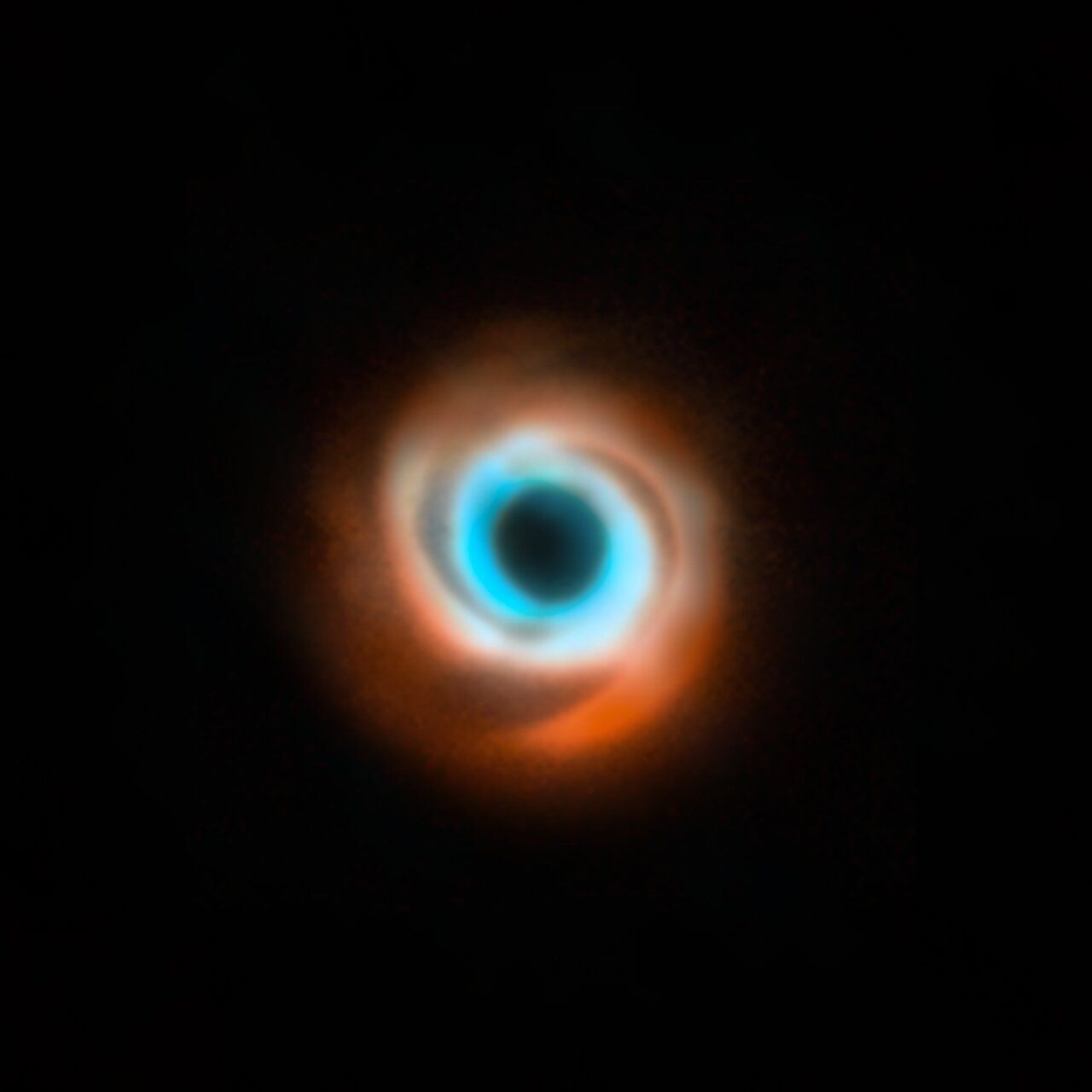 This image shows the dusty disc around the young star HD 135344B. It’s a combination of data taken with two different facilities: the Spectro-Polarimetric High-contrast Exoplanet Research (SPHERE) instrument at ESO’s VLT in red, and the Atacama Large Millimeter/submillimeter Array (ALMA) in orange and blue. The original SPHERE and ALMA images were released in 2016 and 2015 respectively and didn’t show evidence for the presence of a planet in this disc, first revealed in 2025. (Credit: ESO/T. Stolker et al./ALMA (ESO/NAOJ/NRAO)/N. van der Marel et al.)