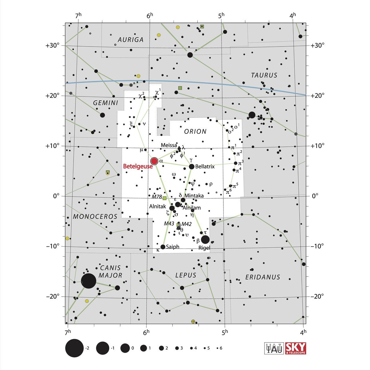 A photograph of the constellation Orion with annotations from IAU and Sky & Telescope. (Credit: E. Slawik/NOIRLab/NSF/AURA/M. Zamani)