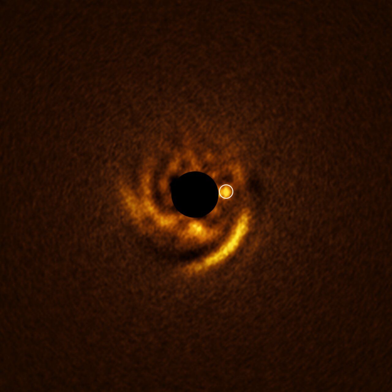 Spiral features like these can be sculpted by planets, although this image doesn’t show evidence of companions orbiting HD 135344B. However, new observations at somewhat longer wavelengths, obtained with the Enhanced Resolution Imager and Spectrograph (ERIS) at the VLT, have found a possible young planet around this star. (Credit: ESO/T. Stolker et al.)