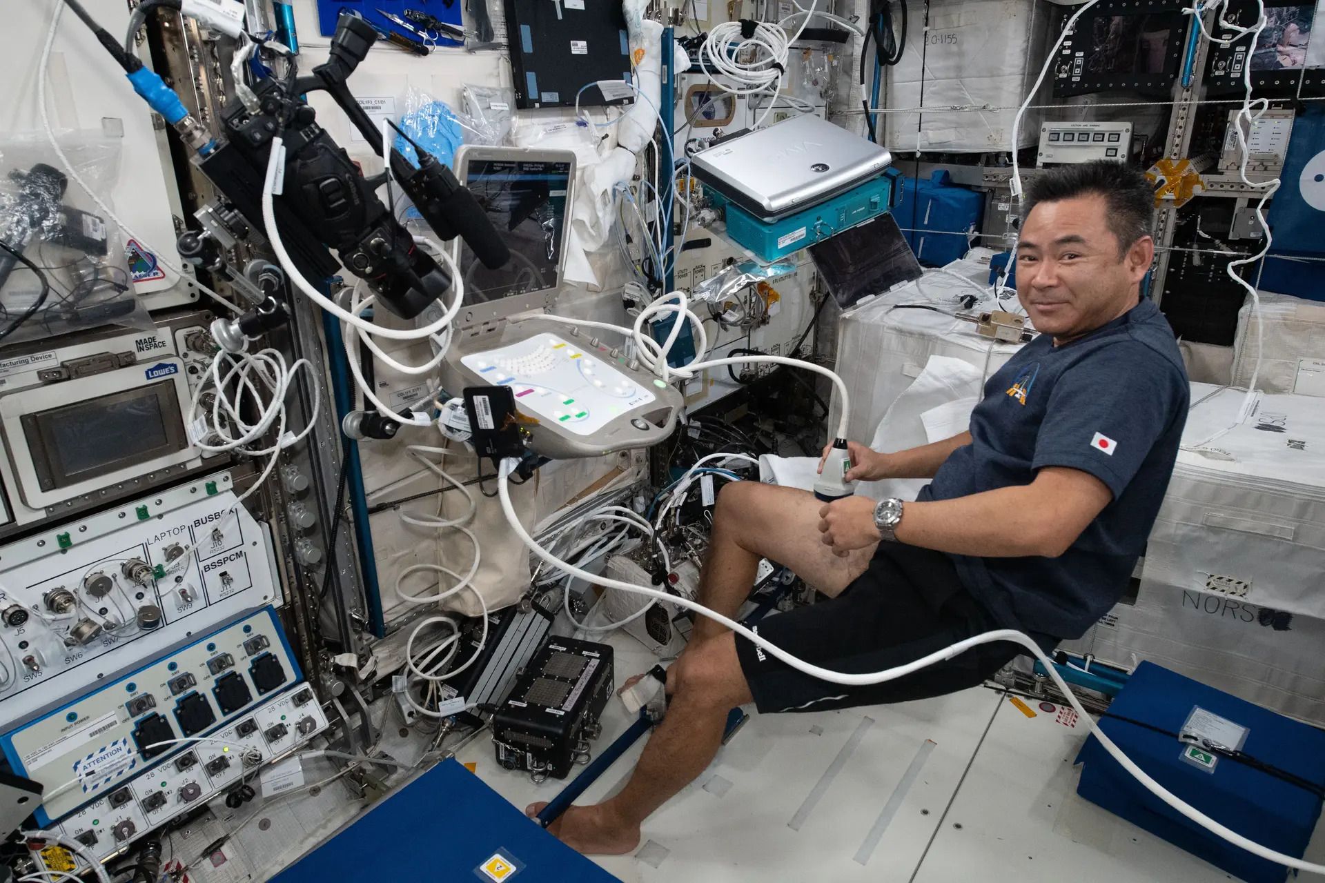 AXA astronaut Akihiko Hoshide conducts a leg artery ultrasound as part of the Canadian Space Agency’s Vascular Aging study. Credit: NASA