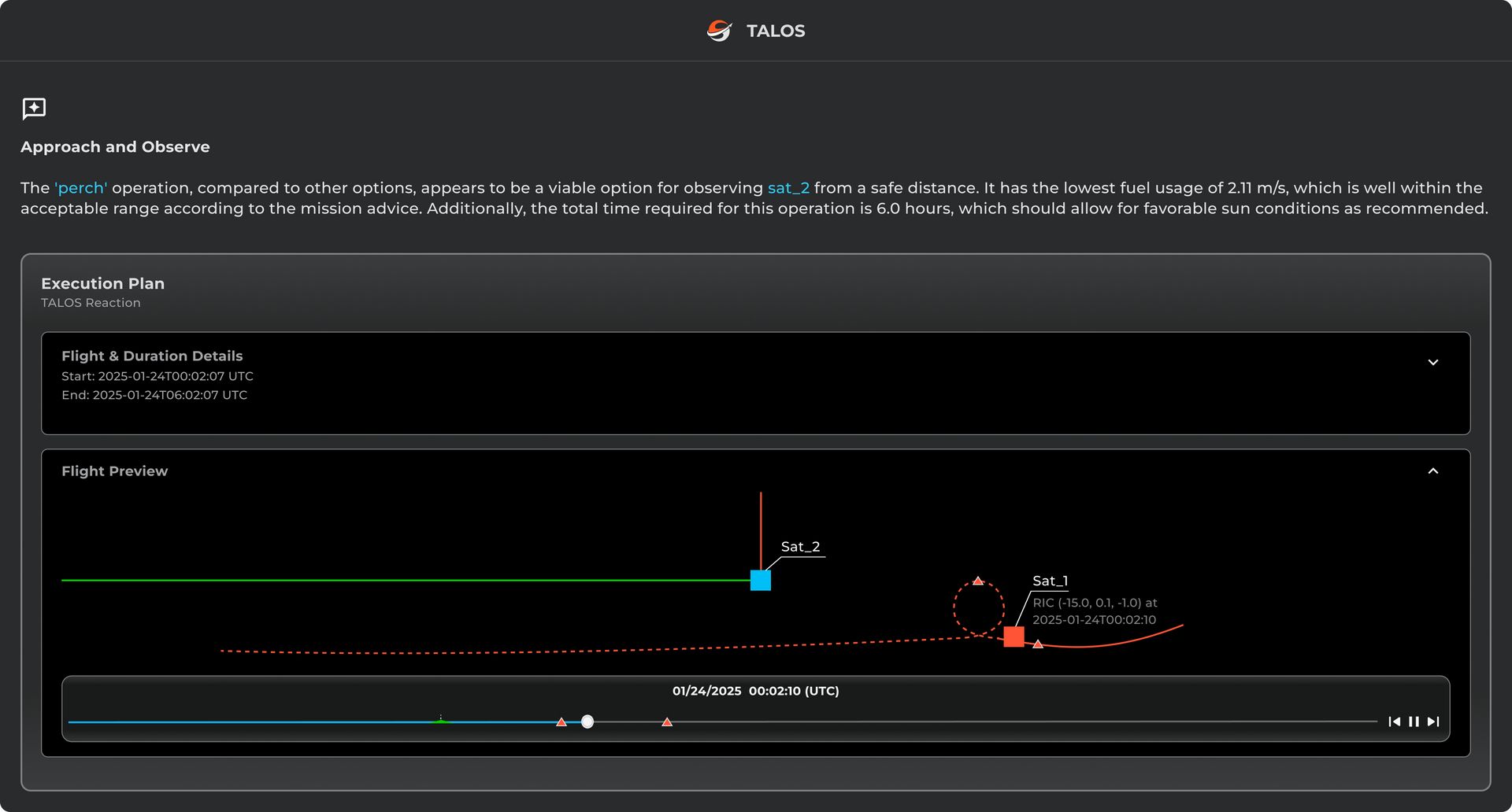 The TALOS interface: TALOS is an autonomous AI system designed to model satellite tactics—such as training scenarios, orbital maneuvers, and space conflict—within a physics-based simulation environment. Its interface enables intuitive visualization, transparent AI decision-making, and smooth integration across both training and live mission applications. (Credit: Slingshot Aerospace)