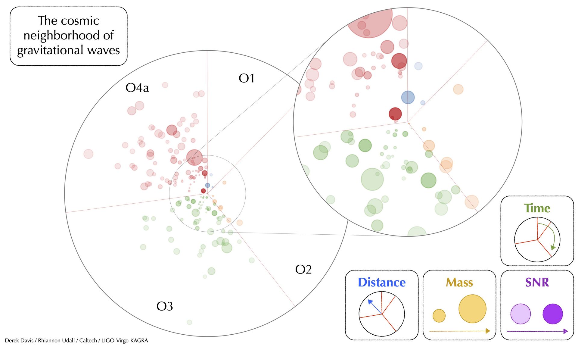 Visualization of gravitational wave detections from LIGO-Virgo-KAGRA’s first four observing runs, showing the distribution of black hole and neutron star mergers by time, mass, distance, and signal strength. Each colored circle represents an individual event, with size and hue encoding key parameters. Insets highlight clustering patterns across the expanding catalog of compact object collisions. (Credit: Derek Davis / Rhiannon Udall / Caltech / LIGO-Virgo-KAGRA)