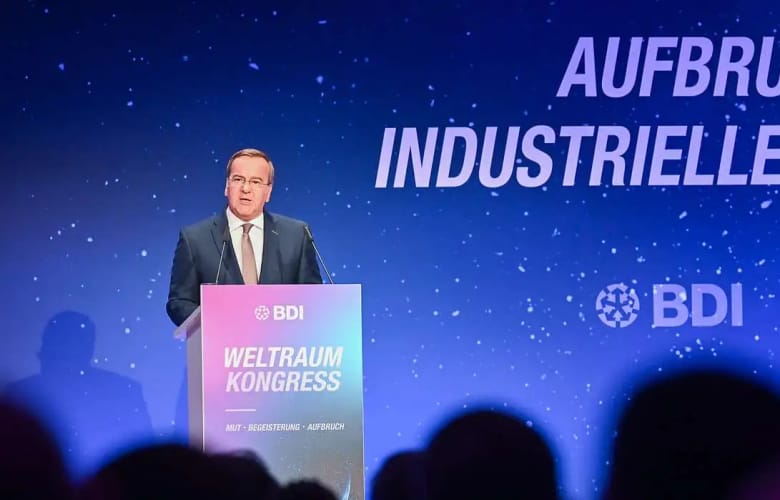 German Defense Minister Boris Pistorius delivers remarks at the Federation of German Industries Space Congress in Berlin on September 25. (Credit: BDI/Christian Kruppa)