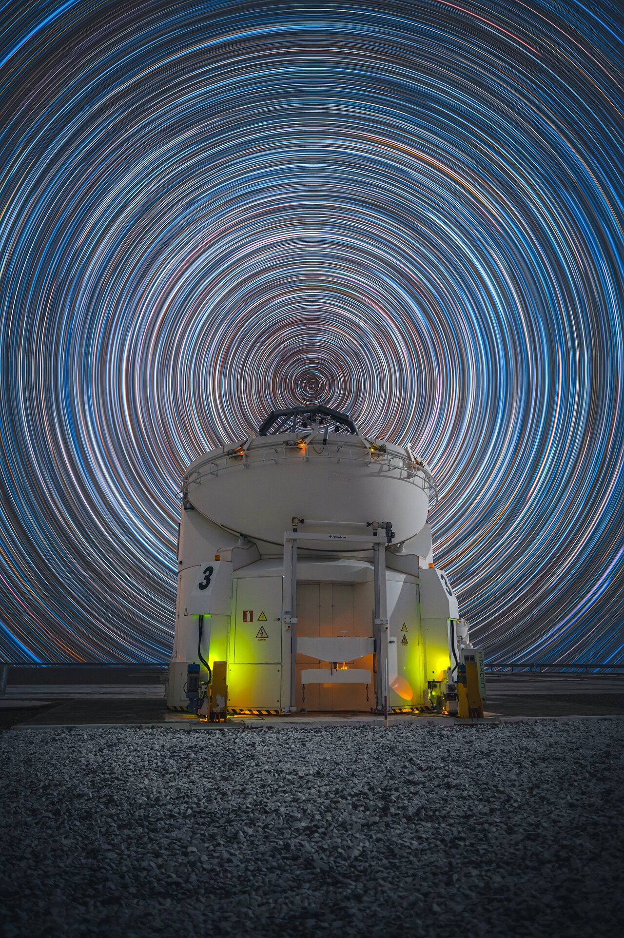 Photographer Osvaldo Castillo recorded nearly 300 exposures over several hours, later combining them to reveal concentric arcs of starlight centered on the southern celestial pole. The alignment of one of the observatory’s Auxiliary Telescopes with this pole creates the illusion of the sky revolving around the instrument. The image illustrates both the technical challenges of astrophotography and the precision of Paranal’s facilities, highlighting how ground‑based observatories contribute to public engagement alongside scientific discovery. (Credit: O. Castillo/ESO)