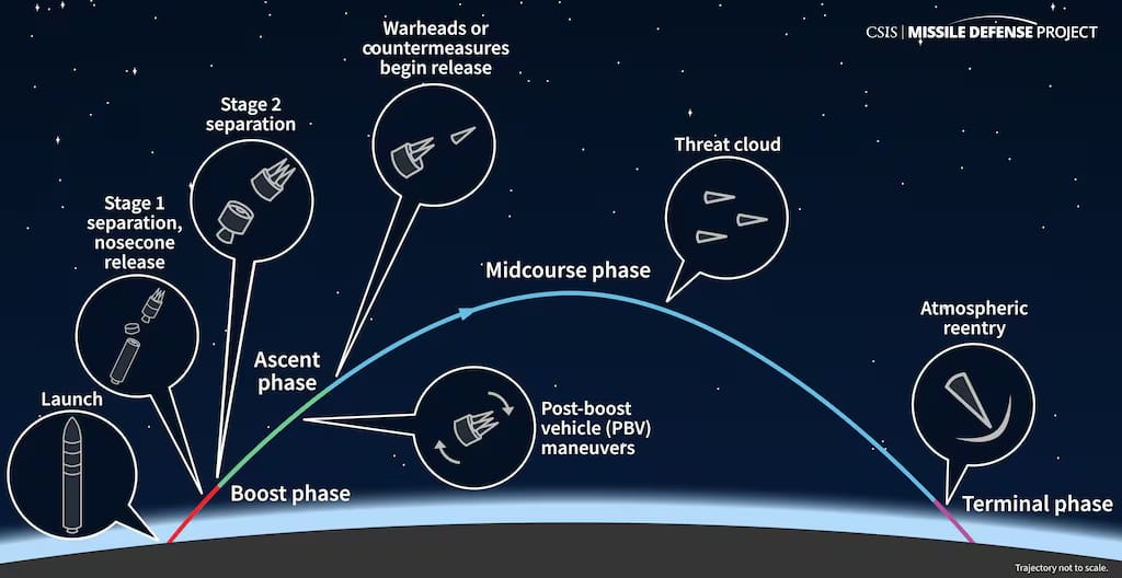 The interceptors are designed to target missiles in their boost phase, when rockets are most visible but require near‑instant response (between 0.5 - 4 minutes), demanding large constellations in low Earth orbit. Golden Dome, overseen by Gen. Michael Guetlein, envisions a layered homeland defense architecture combining sensors, command systems, and both ground‑ and space‑based interceptors. A parallel solicitation for midcourse interceptors, that intercept the target later, is expected in early 2026, reflecting debate over whether boost‑phase or midcourse defense offers more feasible coverage.