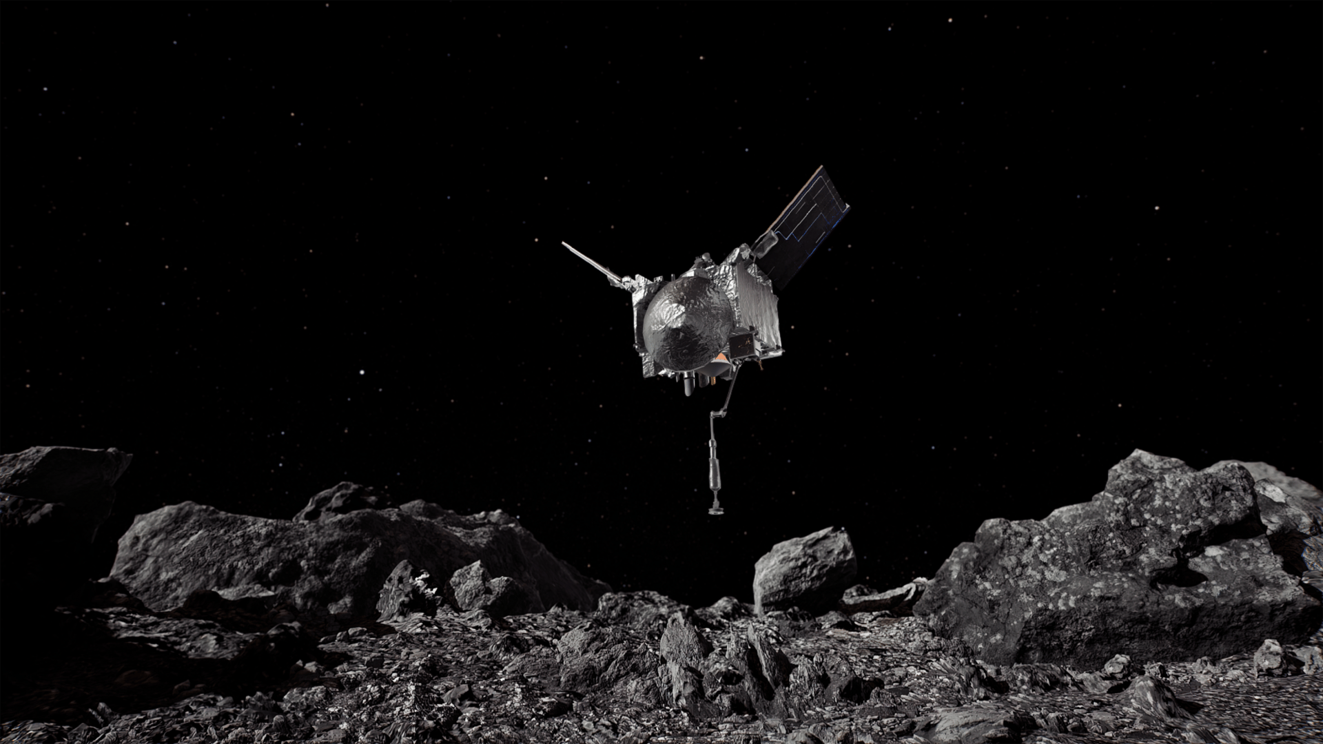 A rendering of of the OSIRIS-REx spacecraft descending towards asteroid Bennu to collect a sample. (Credit: NASA/Goddard/University of Arizona)