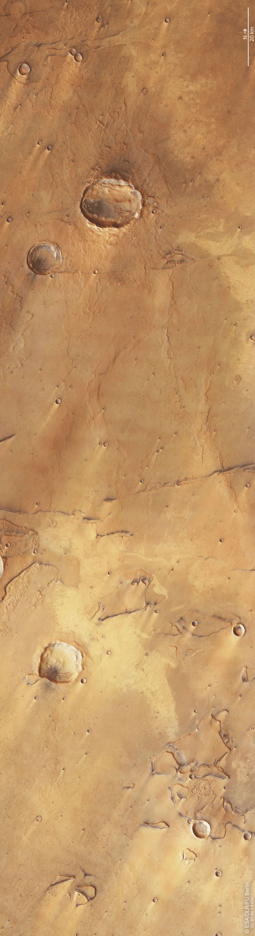 The visualization is derived from a digital terrain model combined with nadir and colour channels of the High Resolution Stereo Camera (HRSC) aboard ESA’s Mars Express. Operated by the German Aerospace Center (DLR), the HRSC data were systematically processed at the DLR Institute for Planetary Research in Berlin‑Adlershof. The Planetary Science and Remote Sensing group at Freie Universität Berlin then used these datasets to generate the flyover film, offering a detailed reconstruction of the Idaeus Fossae landscape. (Credit: ESA/DLR/FU Berlin)