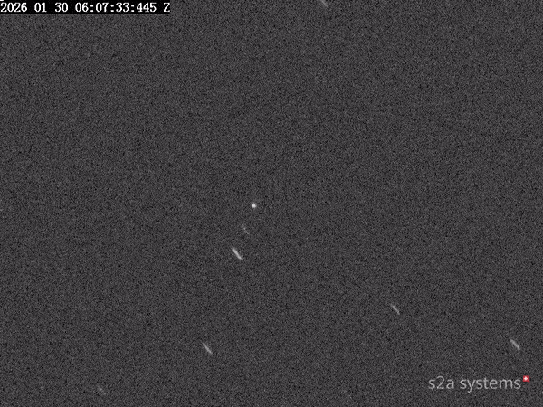 Optical tracking by s2A Systems captured the fragmentation of Russia’s Luch/Olymp inspector satellite in graveyard orbit on Jan. 30, 2026, showing multiple debris pieces dispersing from the spacecraft. (Credit: s2A Systems)