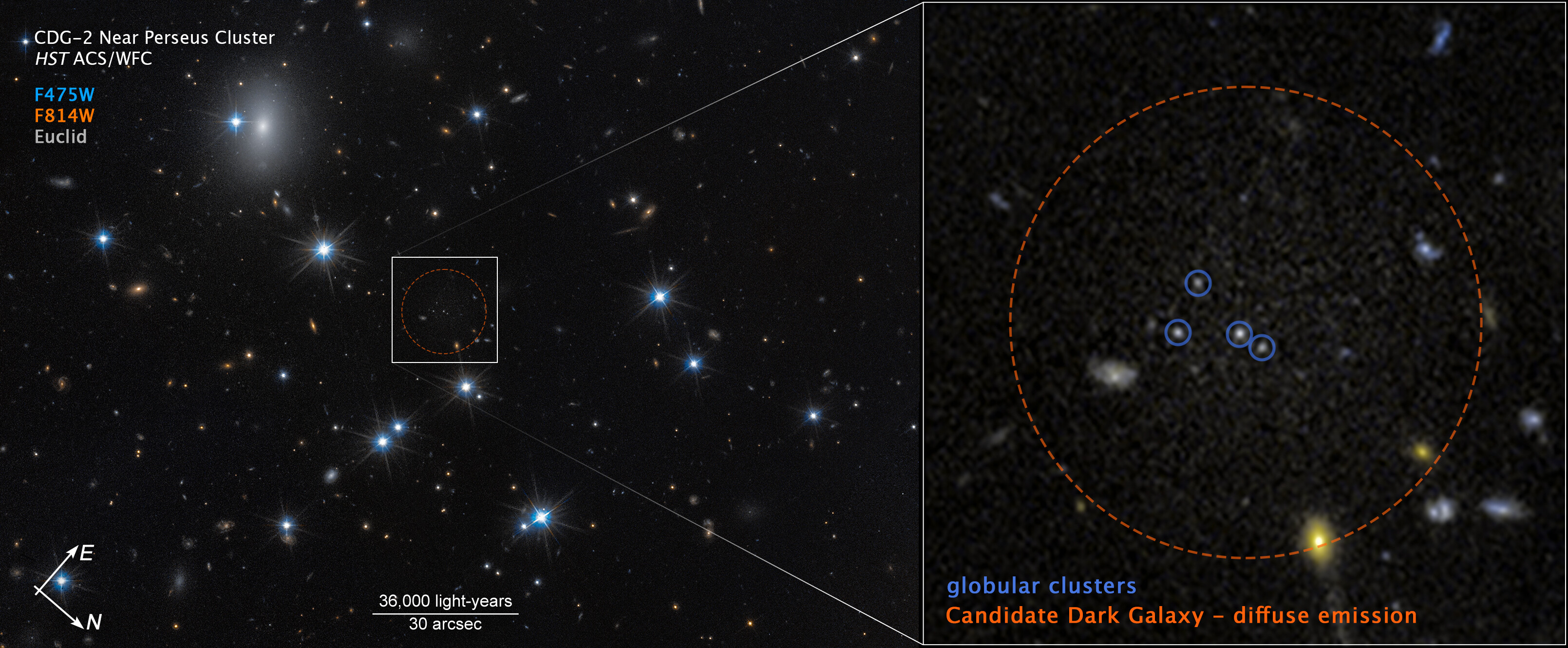 Astronomers using Hubble, Euclid, and the Subaru Telescope confirmed Candidate Dark Galaxy-2 (CDG-2), an extremely faint galaxy in the Perseus cluster whose presence was first inferred from a compact grouping of four globular clusters (compared to the Milky Way’s 150-plus). Follow‑up imaging revealed a diffuse stellar glow totaling the luminosity of roughly one million Suns, making it one of the most dark‑matter‑dominated systems known, with about 99% of its mass in dark matter. Researchers identified CDG‑2 through statistical searches for globular‑cluster groupings, a method suited to galaxies stripped of gas and stars by cluster interactions, leaving only dense clusters as durable tracers of hidden structure. (Credit: NASA, ESA, D. Li (Utoronto), Image Processing: J. DePasquale (STScI))