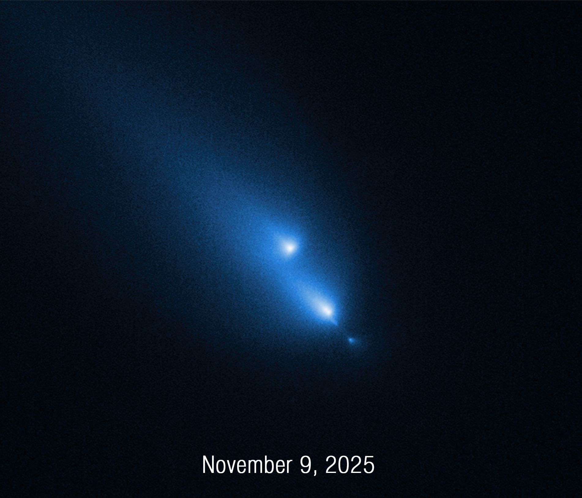 This series of Hubble Space Telescope images of the fragmenting comet C/2025 K1 (ATLAS), or K1 for short, was taken over the course of three consecutive days: November 8, 9, and 10, 2025. Captured by Hubble’s STIS (Space Telescope Imaging Spectrograph) instrument, the sequence shows the progressive disintegration of the comet over this brief period. This is the first time Hubble has witnessed a comet so early in the process of breaking up. (Credit: NASA, ESA, D. Bodewits (Auburn). Image processing: J. DePasquale (STScI))