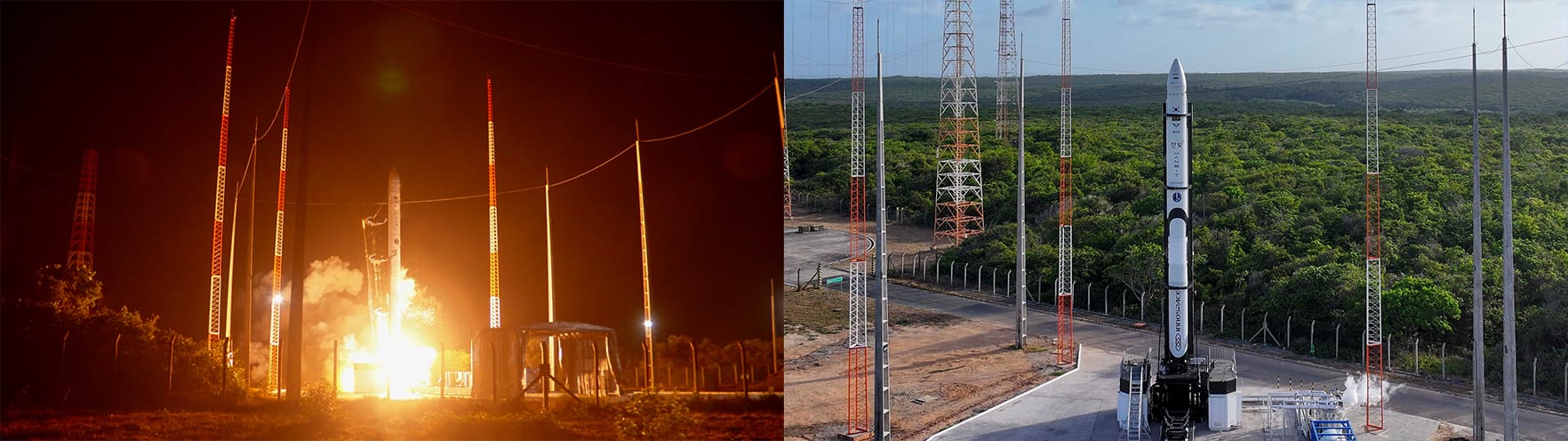 HANBIT-Nano lifting off from the Alcântara Space Center in Brazil (left) during its first commercial launch (Dec. 23, 2025, KST) and the launch vehicle and the Alcântara Space Center in Brazil (right). (Credit: Innospace)