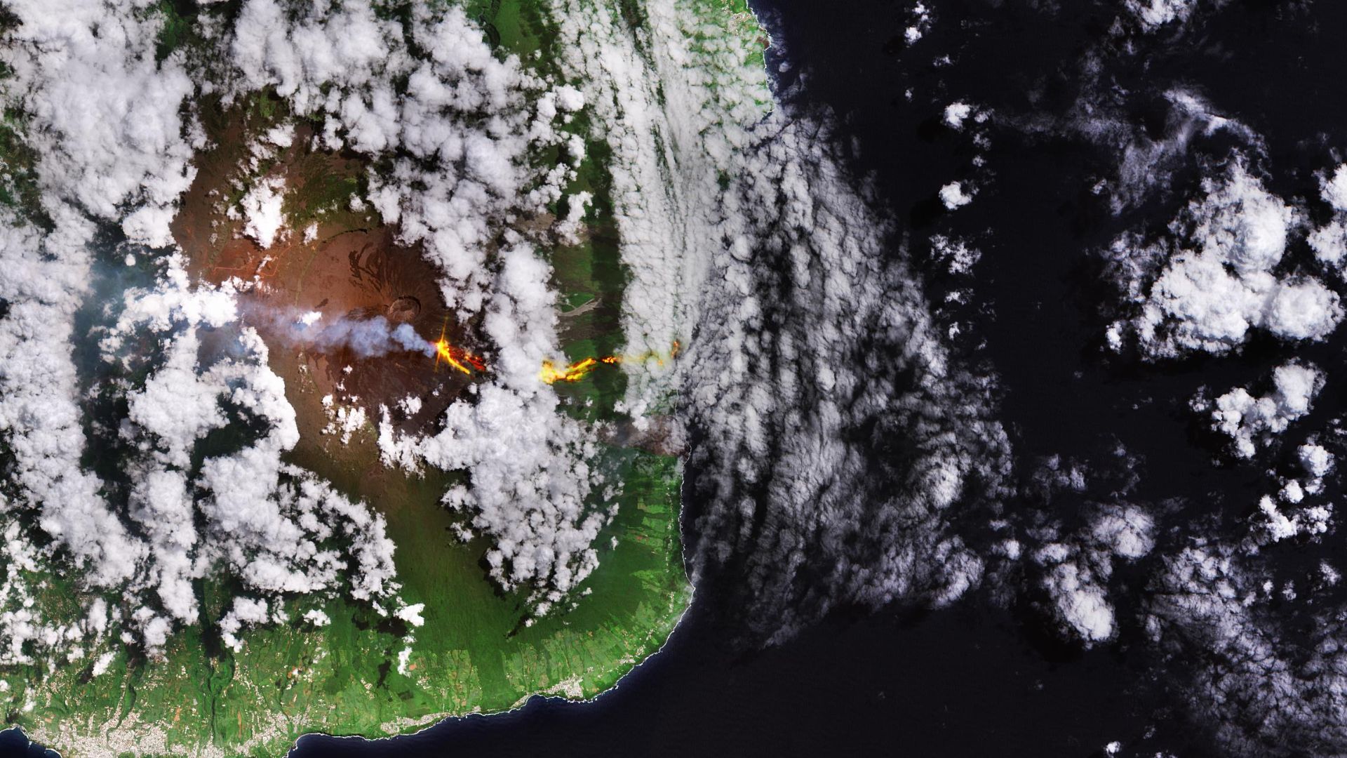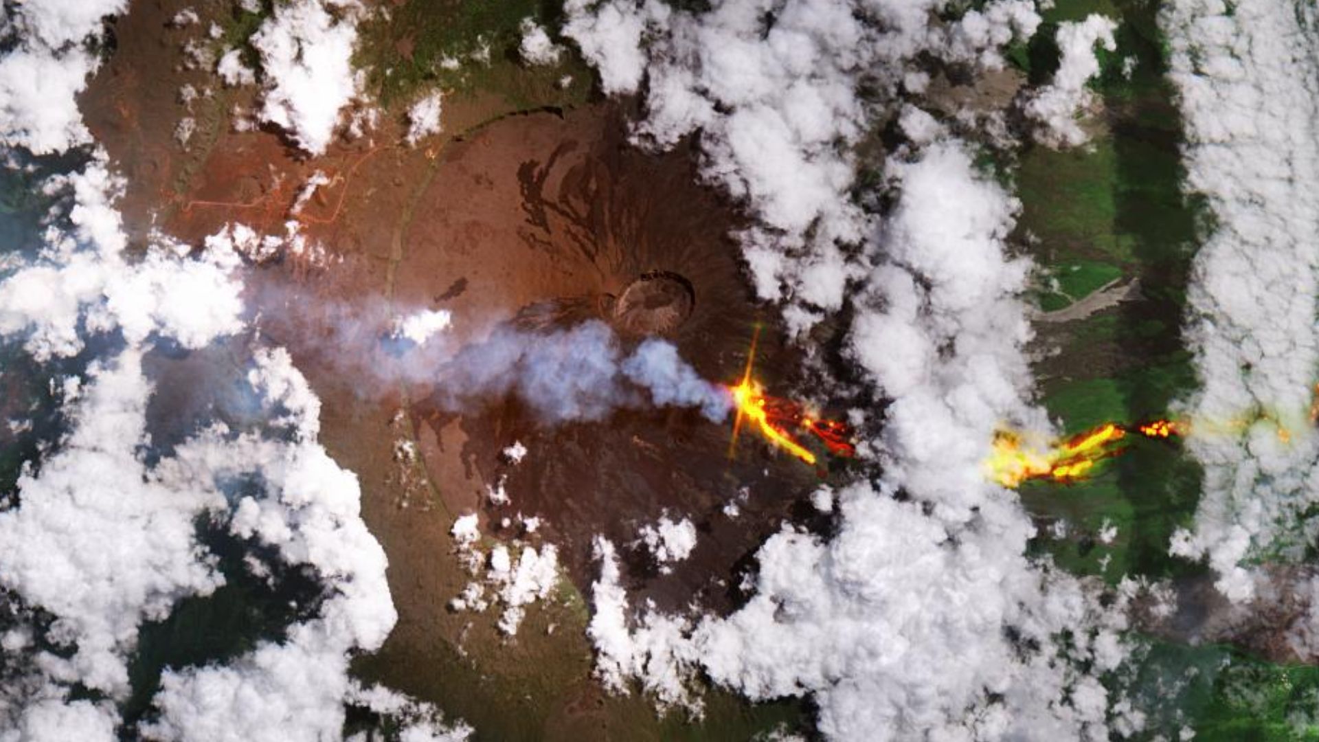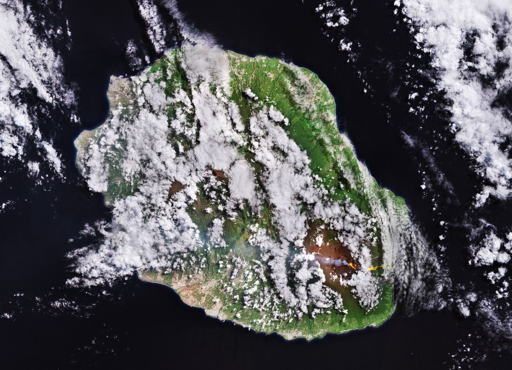 The Copernicus Sentinel‑2 mission captured new imagery of an active lava flow on Piton de la Fournaise, one of the world’s most active volcanoes, located on France’s Réunion Island in the Indian Ocean. The centre of the island shelters three vast cirques, or calderas, created by huge collapses. Together they form the dormant shield volcano, and highest peak of the island, Piton des Neiges (3069 m), which peeps out in brown from beneath the clouds near the centre of the image. (Credit: ESA)