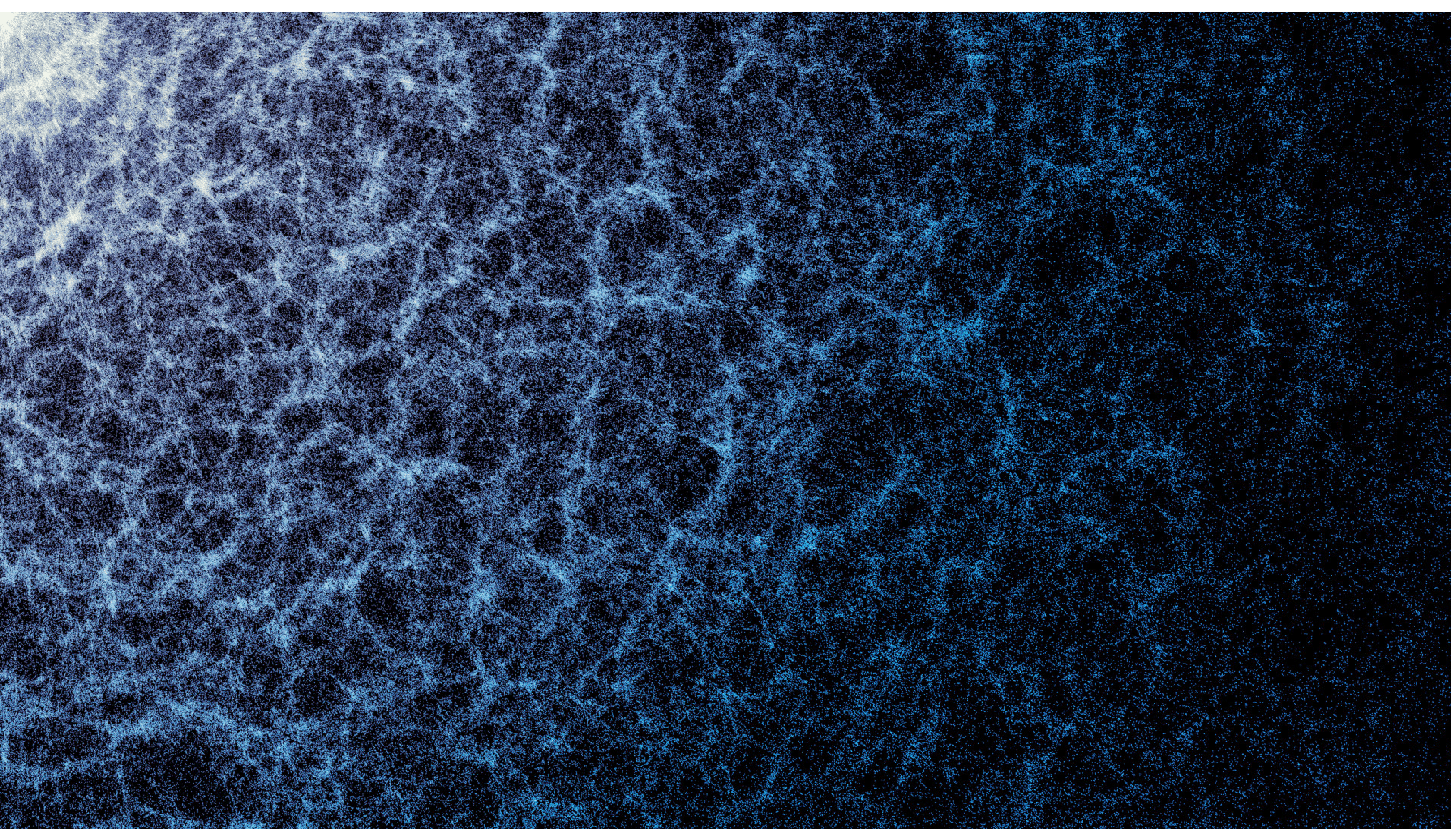 A small section of DESI’s year‑five map shows the Universe’s large‑scale structure shaped by gravity. Each dot marks a galaxy, with dense regions tracing the filaments of the cosmic web and large voids appearing between them. (Credit: DESI Collaboration and DESI Member Institutions/DOE/KPNO/NOIRLab/NSF/AURA/R. Proctor; Image Processing: M. Zamani (NSF NOIRLab))