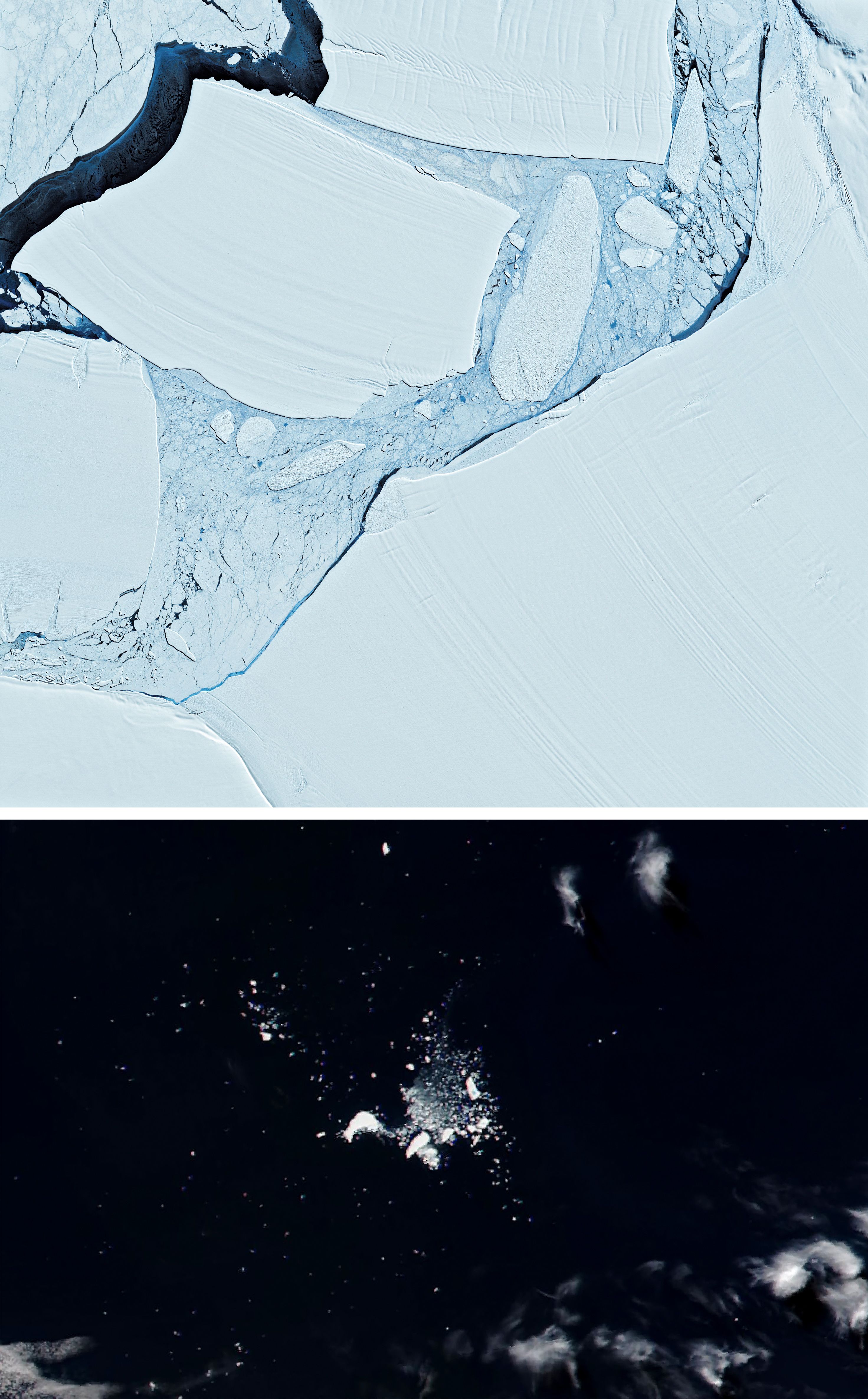 Satellite data from Landsat, Terra, Aqua, NOAA‑21, and other platforms documented its trajectory from the Weddell Sea to its final disintegration, including rapid melt, surface ponding, and fragmentation. The U.S. National Ice Center transferred tracking to Argentina’s meteorological service in February as the berg entered shipping lanes. (Credit: NASA Earth Observatory)