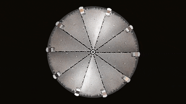 A small patch of DESI’s 5000 fiber-optic “eyes” at work. The robotic fiber positioners can be seen moving around their patrol area. The fibers themselves are back-illuminated with blue light so that their positions can be measured with the Fiber View Camera. (Credit: Claire Poppett/DESI Collaboration)