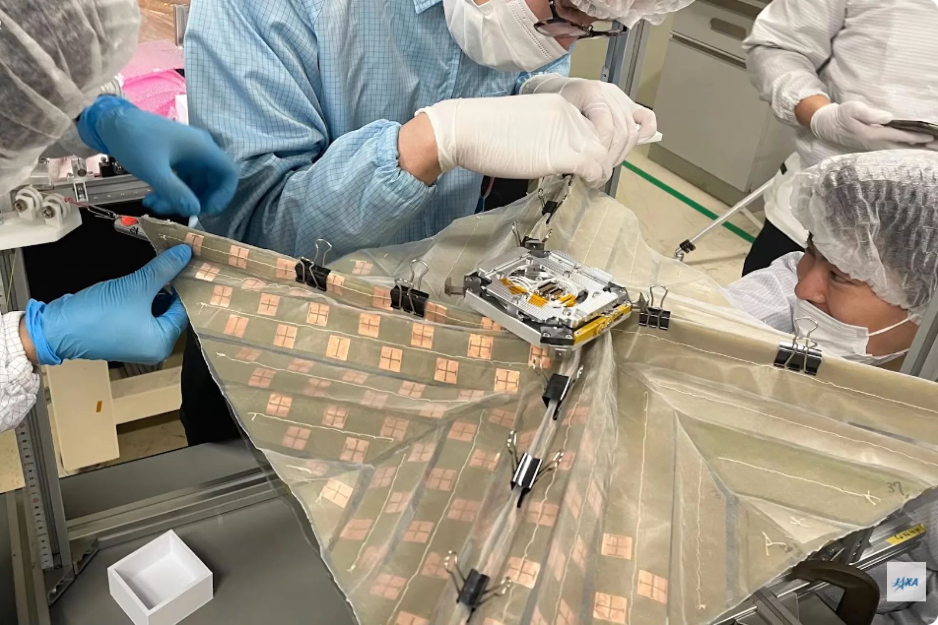 The OrigamiSat‑2’s folding 2-layer membrane being prepared for stowage before the launch. (Credit: JAXA)